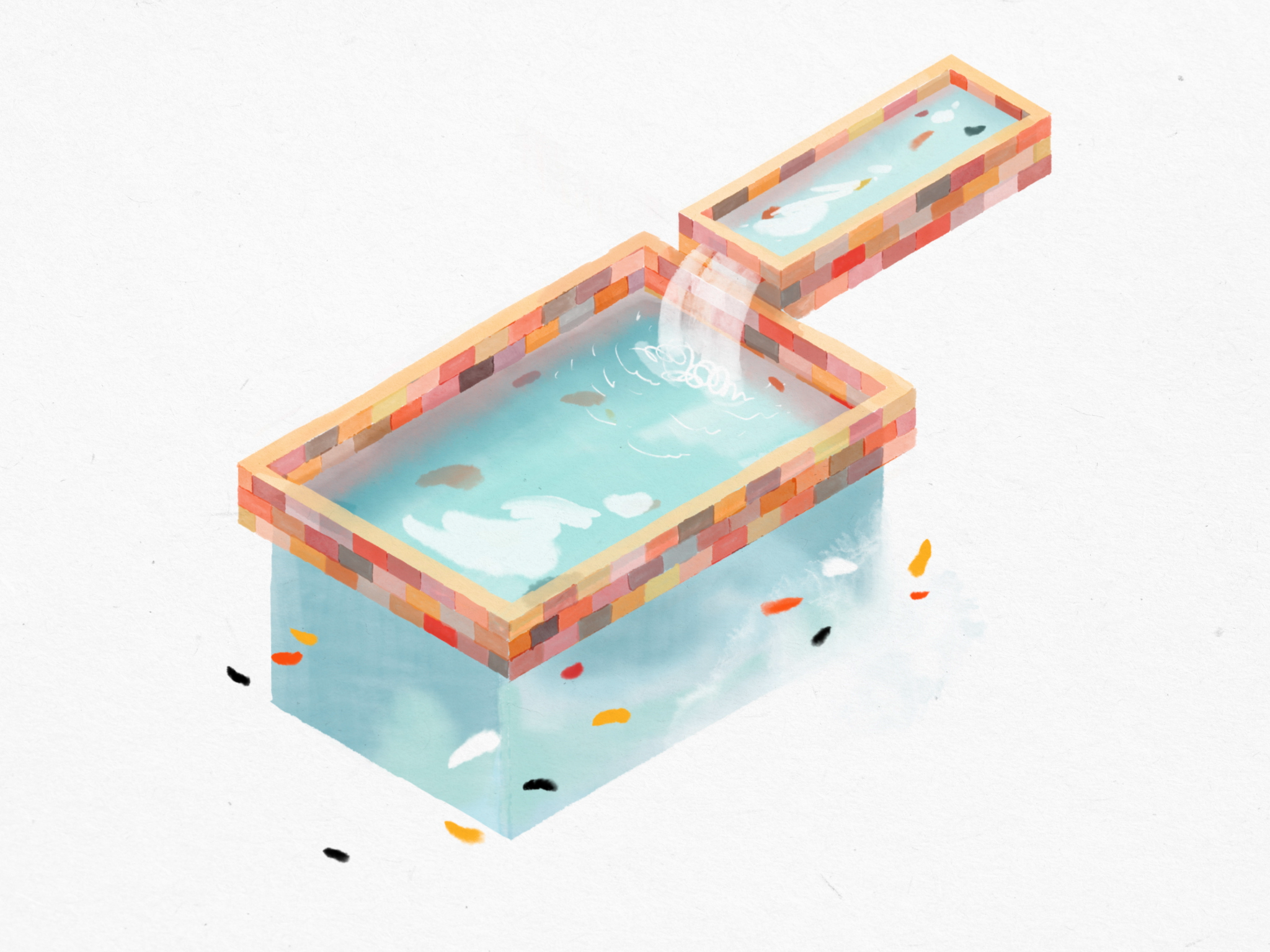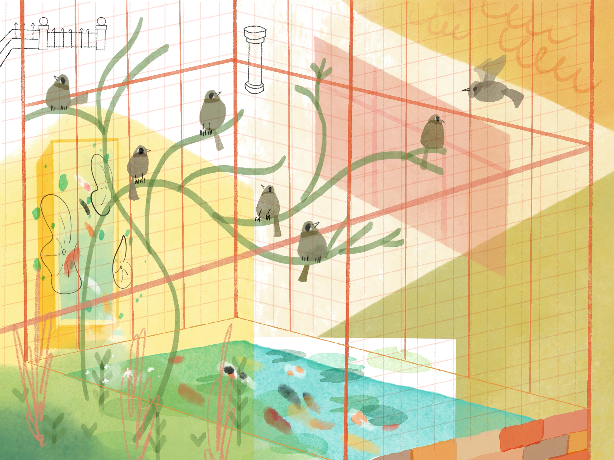 A koi pond with a waterfall. A towering birdcage. Huge rooms.